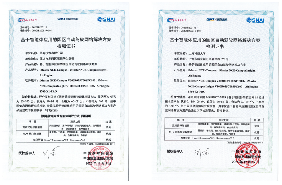近日,中國信息通信研究院(以下簡稱“中國信通院”)依據CCSA TC610(SDN/NFV/AI標準與產業推進委員會)發布的《網絡管理運維智能體測評方法 園區網》技術規范,組織開展園區網絡解決方案自智能力分級測評工作,面向產業界提供權威、規范的能力驗證與評估服務,推動園區網絡管理運維向自動化、智能化方向加速演進。