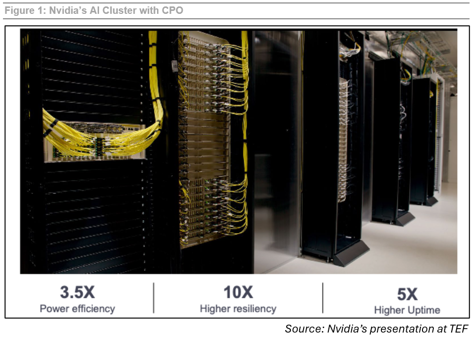 今年12月初,由以太網聯盟舉辦的TEF大會上,英偉達報告稱,基于CPO交換機的AI集群在可靠性方面相比采用可插拔光模塊的系統(tǒng)提升了10倍。如下圖所示,高可靠性轉化為集群運行時間5倍的提升。